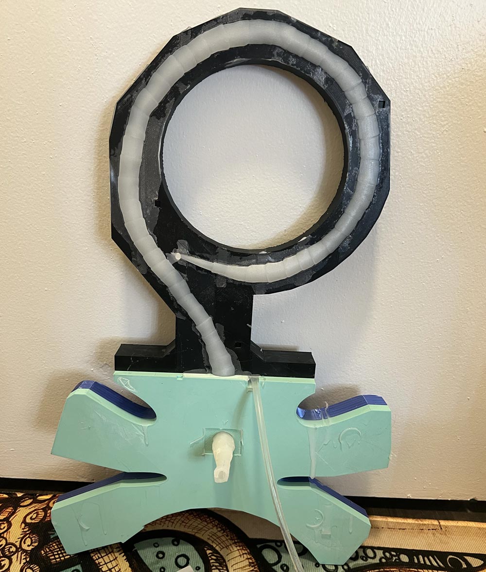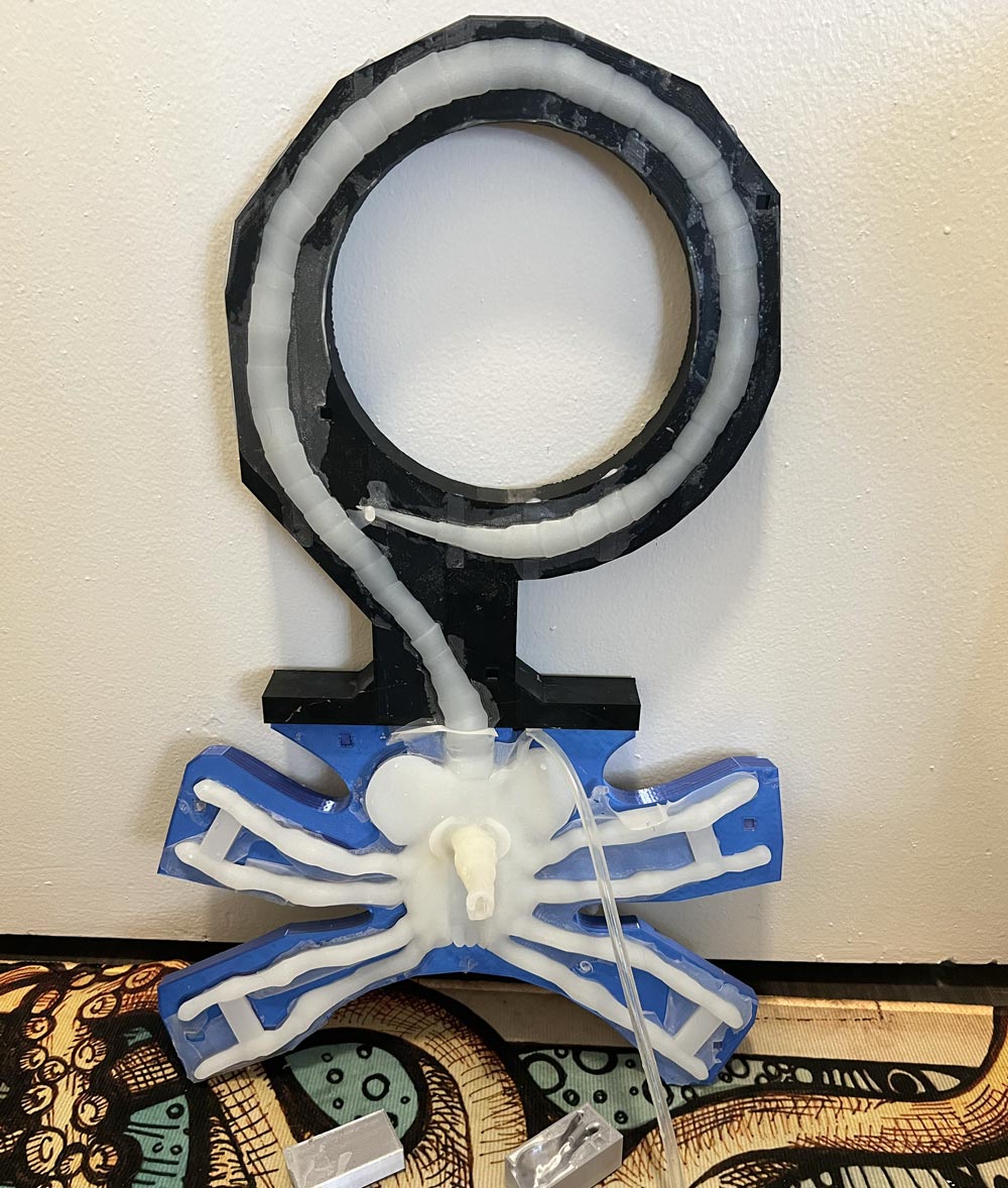 Anyway, the goal of the project is a custom-fitted soft silicone insert, shaped precisely to fit the wearer, with a stroker like a Fleshlight built in, so that the host cannot feel or gain pleasure from the intercourse. The final version of the toy will have an alien mouth surrounded by tentacles, that wrap around the host’s legs to hold it firmly in place.